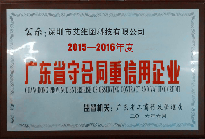 2017年09月,經廣東省工商行政管理局評審委員會評審通過,近日公布了2016年“廣東省守合同重信用”名單,深圳市艾維圖科技有限公司獲此殊榮。
