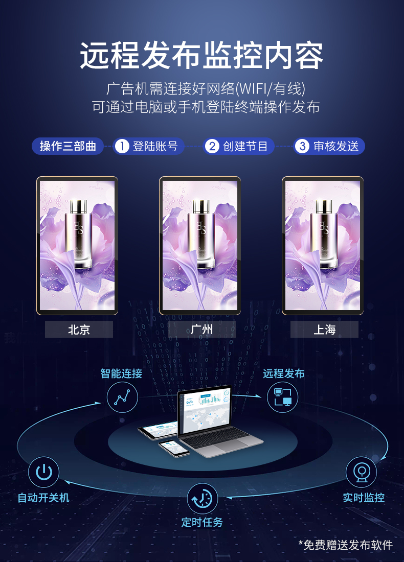 網(wǎng)絡(luò)/單機:單機版廣告機和網(wǎng)絡(luò)版廣告機的區(qū)別主要體現(xiàn)在后期維護上面,網(wǎng)絡(luò)版液晶 廣告機適用于數(shù)量大、跨地域、時效性要求高的部署場合。