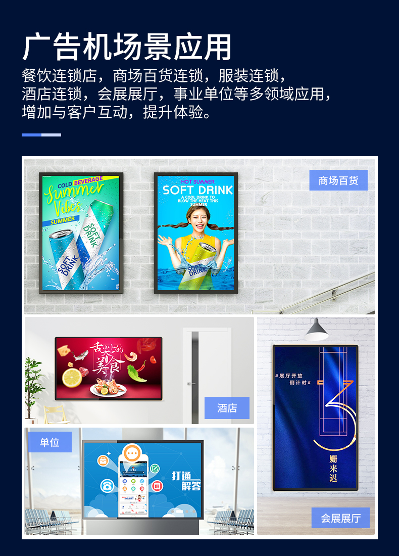 部署場合:列舉幾種常見的部署場景,銀行液晶廣告機、餐廳液晶廣告機、商場、醫(yī)院、 車站、機場、連鎖店等。