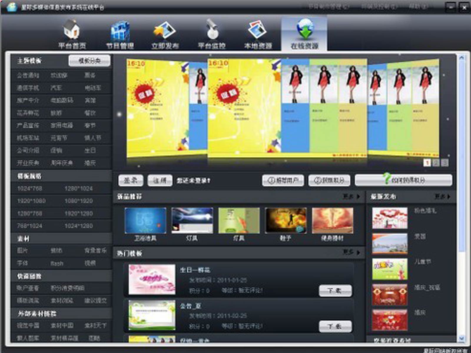 多樣表現方式 視覺盛宴 支持視頻、圖片、文字、滾動字幕、及時數據等多種素材顯示,支持全屏與分屏顯示節目,支持多臺機器同步播放,超震撼視覺效果 |